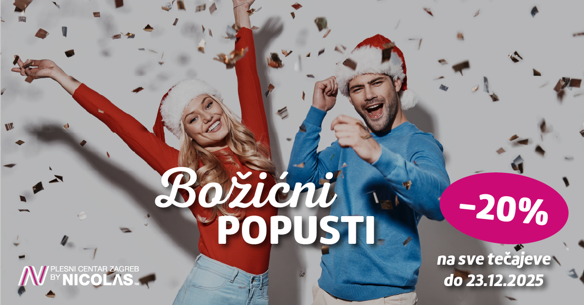 Naš poklon Vama je blagdanski popust od 20 % pri upisu tečajeva! Dođite već danas i upišite se na plesni tečaj koji želite ili poklonite dragoj osobi plesni poklon bon! 🤩